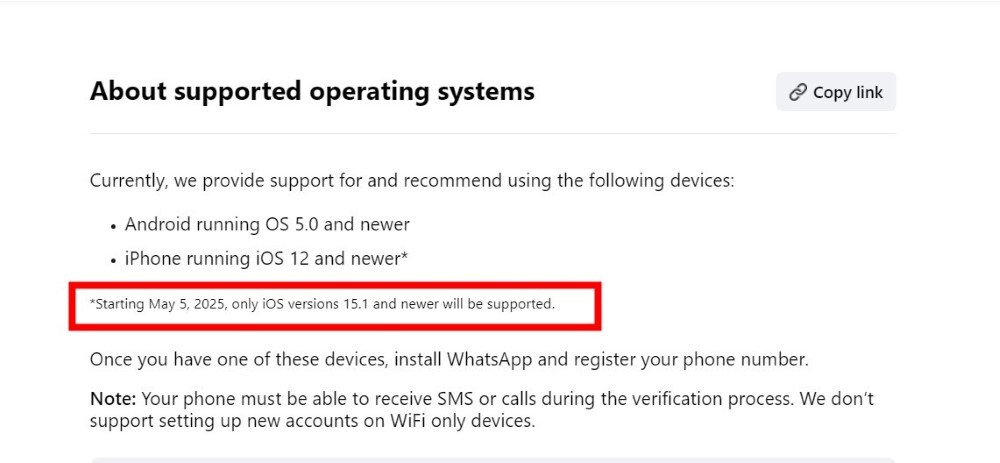 وبحسب ما ورد، قام WhatsApp بتحديث صفحة الأسئلة الشائعة الرسمية وأضاف سطرًا ينص على “بدءًا من 5 مايو 2025، سيتم دعم إصدارات iOS 15.1 والإصدارات الأحدث فقط”. لن يتمكن المستخدمون بعد الآن من الوصول إلى التطبيق حتى بعد تثبيت إصدار تجريبي سابق من WhatsApp على أجهزتهم.