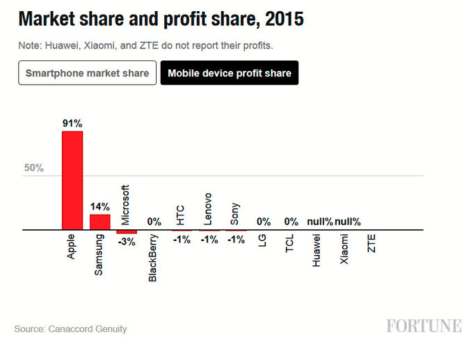 جاء تقرير رسمي نشره موقع Fortune بمثابة الصدمة ، خصوصا لعشاق الارقام مثل كاتب هذه السطور ، حيث كشف عن مدى سيطرة شركة ابل على أرباح صناعة الهواتف الذكية حول العالم ، خلال عام 2015 .