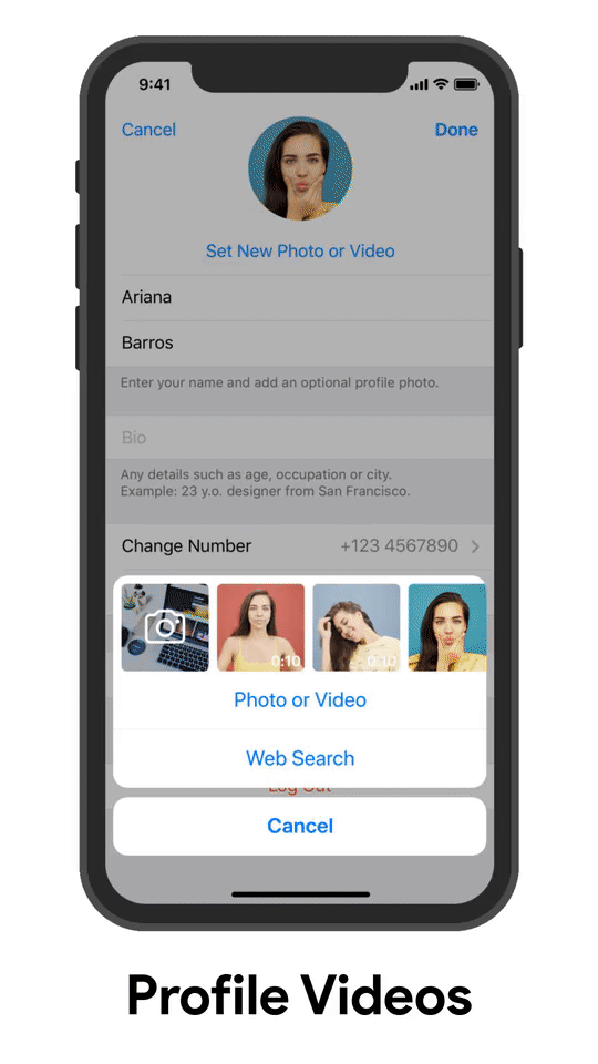 التطبيق يتيح من اليوم ايضا وضع صورة الملف الشخصي على شكل مقطع فيديو قصير يمكنك اضافة فيديو سابق والتعديل عليه او التقاط مقطع فيديو قصير بالكاميرا.