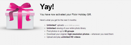 المهم ، فليكر يقدم مجانا الان 3 شهور من خدمة البرو مجانا (سعرها 6.95 دولار كل ثلاثة شهور في المعتاد) وهي الخدمة التي تتيح لك رفع الصور حتى أحجام 50 ميجا للصورة ، وتنزيل نسخة عالية الدقة من صورك اذا احتجت ذلك ، كما تتيح نشر الصور الى مايصل لـ 60 مجموعة مختلفة على فليكر ، بالاضافة الى تحميل ومشاهدة عدد غير محمدود من مقاطع الفيديو HD