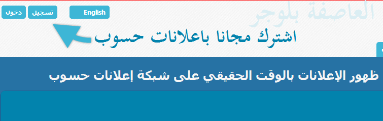 نبدا على بركة الله عملية الإشتراك بشبكة حسوب الإعلانية بالدخول على الصفحة الرئيسية للموقع من - موقع اعلانات حسوب - بعد الدخول الى الصفحة الرئيسية نختار تسجيل كما هو موضح بالصورة.